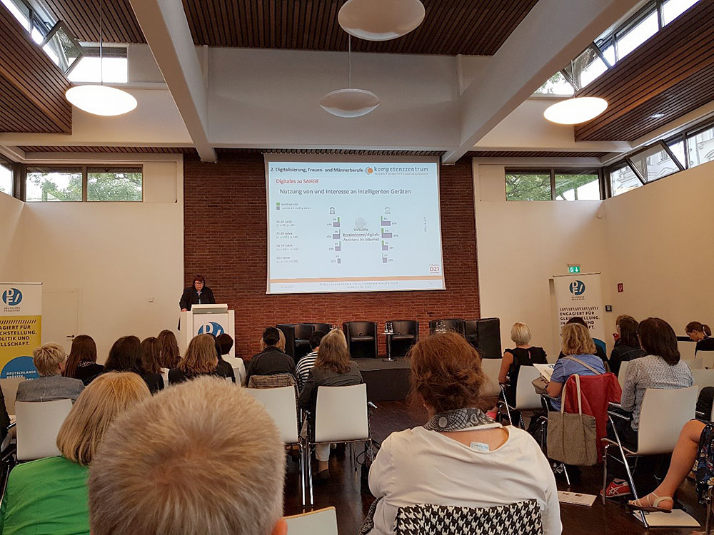 Das Programm der Jahrestagung war thematisch breit angelegt. Neben den allgemeinen Chancen und Risiken der Digitalisierung wurde insbesondere die frauenpolitische Dimension der digitalen Transformation beleuchtet, z.B. Auswirkungen auf den Arbeitsmarkt und die Pflege, Diskriminierung und digitale Gewalt gegen Frauen