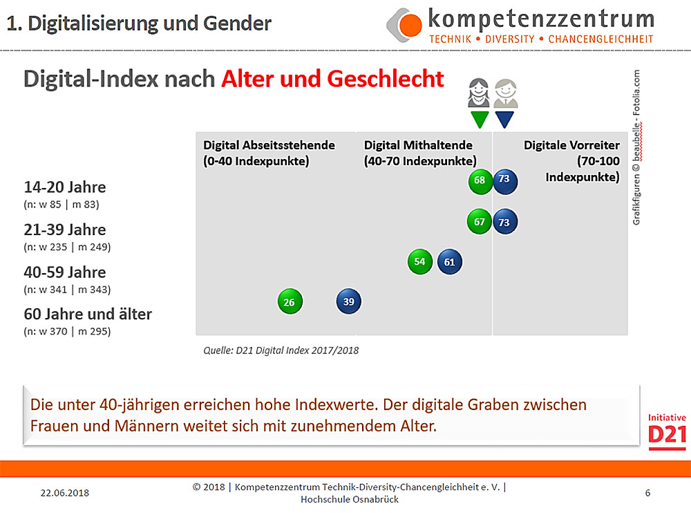 Junge Frauen zwischen14 und 20 Jahren („Digital Natives“) erreichen beim Thema „Digitale Kompetenz“ fast gleich hohe Werte wie die gleichaltrigen Männer: das Kompetenzniveau sinkt aber mit zunehmendem Alter bei Frauen deutlich stärker als bei Männern: