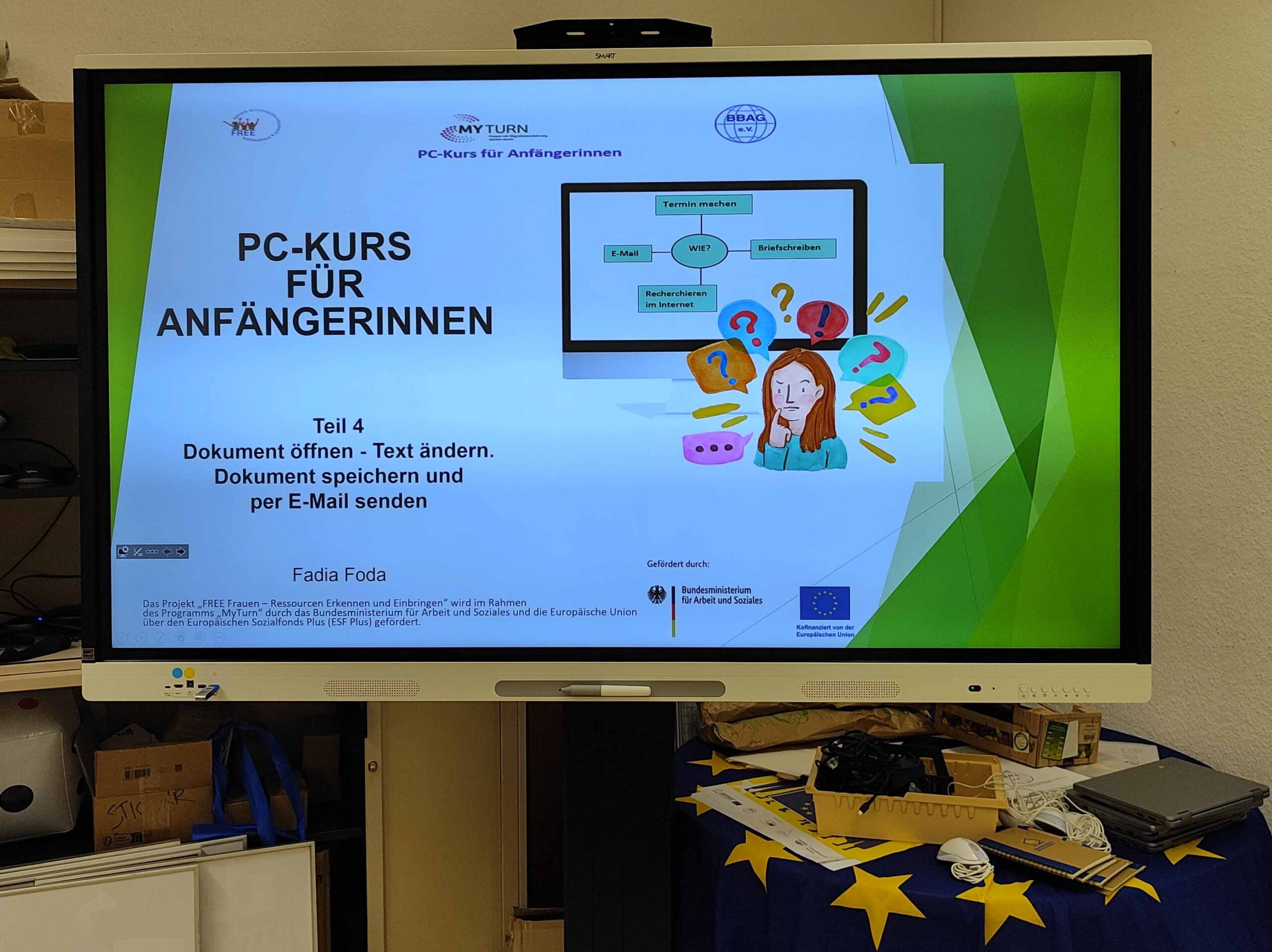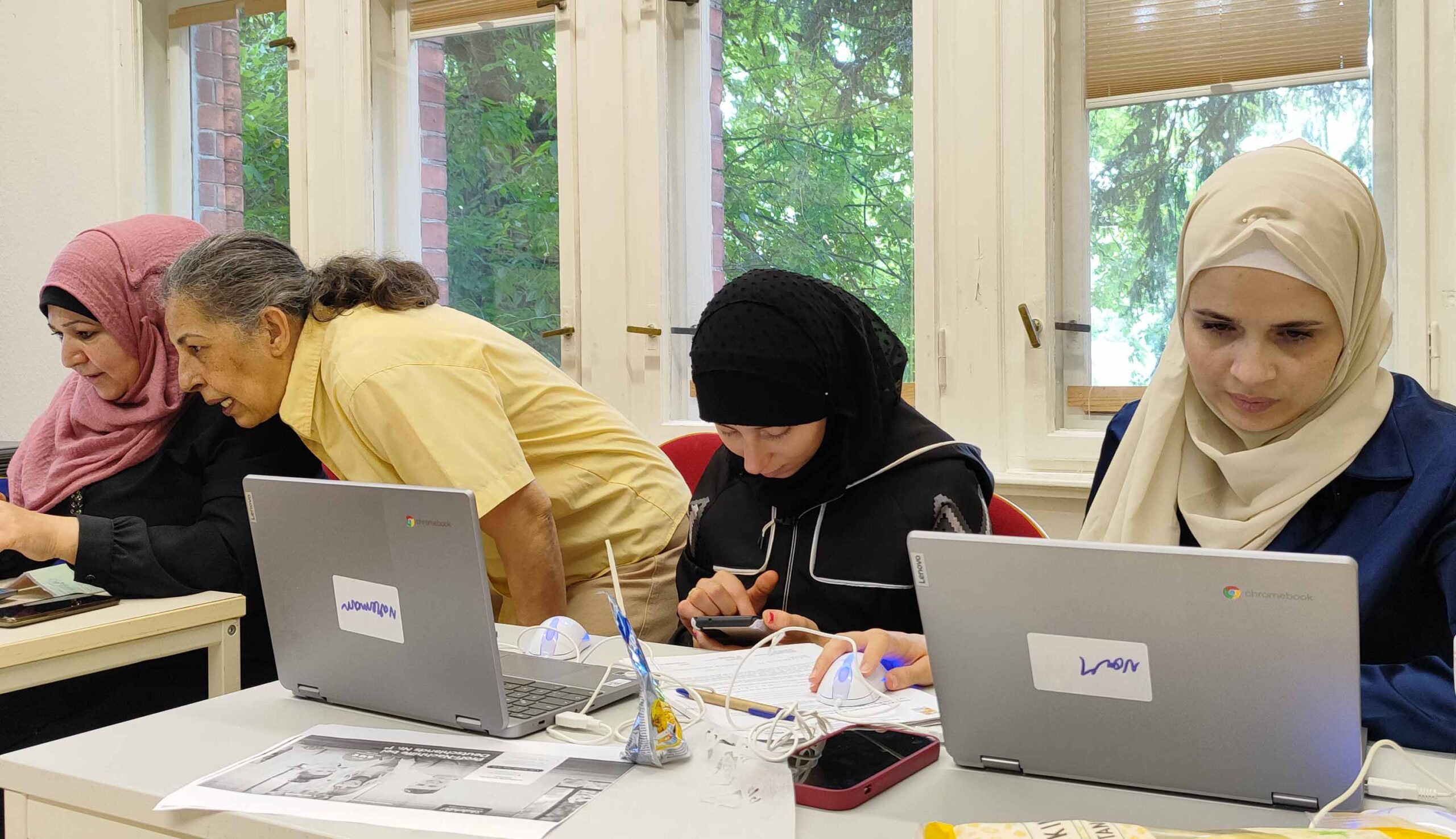 Der Trainingsraum von „FREE“ war mit einem Smartboard ausgestattet, außerdem standen den Teilnehmer*innen aus Syrien und Tansania Chromebooks zur Verfügung. Das Training umfasste vier Trainingstermine à 2,5 Stunden, inklusive einer 30minütigen Pause. Wir konnten die vierte und letzte Trainingseinheit miterleben. Fünf Frauen im Alter von 28 – 43 Jahren nahmen an dem Training teil. Für fast alle war die Handhabung eines Notebooks (Chromebooks) neu. Manche der Frauen konnten schon ganz gut Deutsch sprechen und verstehen, andere waren noch ganz am Anfang mit dem Erlernen der deutschen Sprache. Für diese Frauen war es sehr hilfreich, dass Fadia auch immer alles auf Arabisch erklären konnte. Unterrichtssprache war aber Deutsch, auch weil es eine Teilnehmer*in aus Tansania gab, die kein Arabisch sprach.