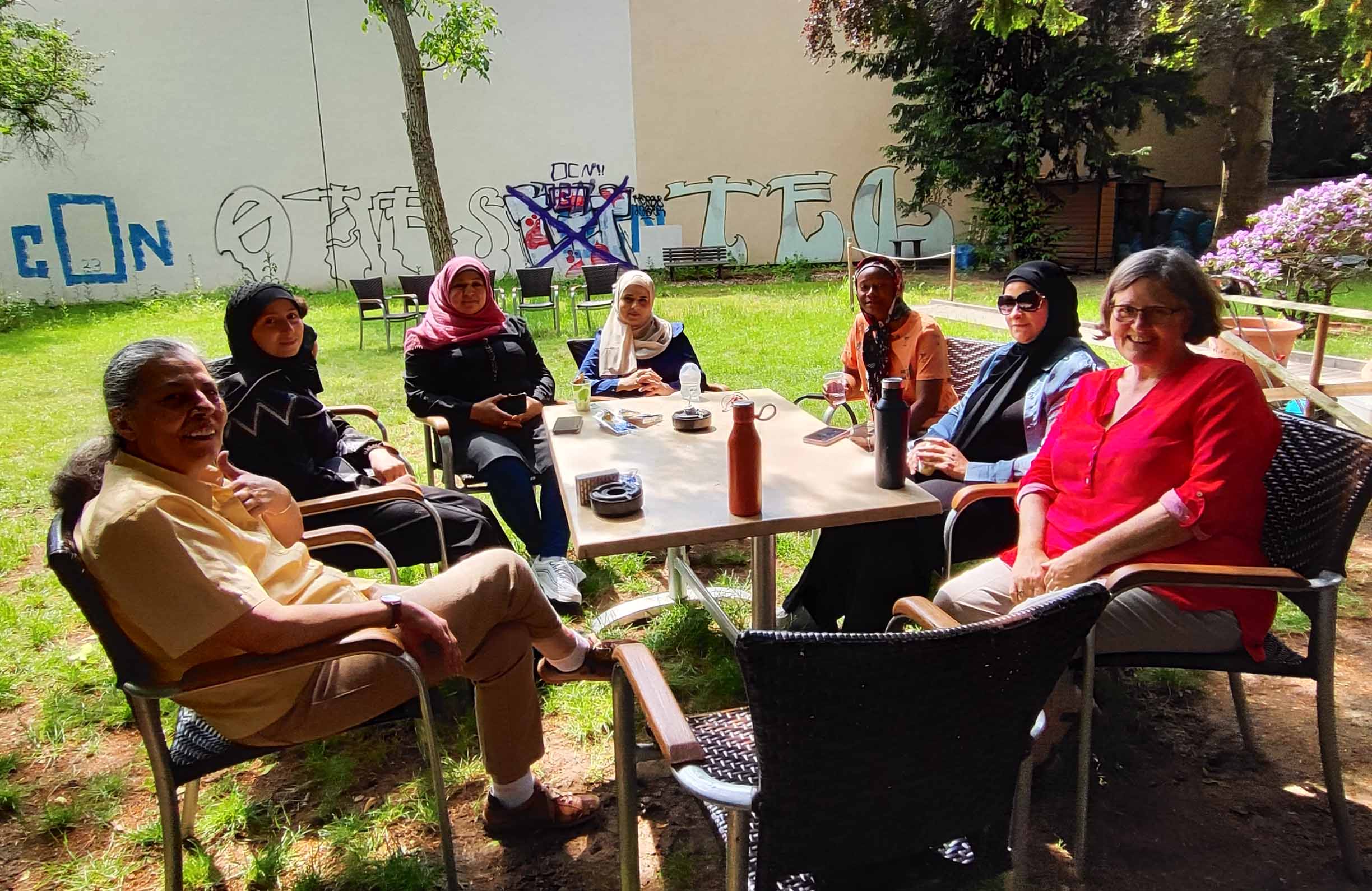 Die Pause verbrachten wir im wunderschönen Garten der alten Villa, in der BBAG e. V. ihre Räume hat. Die Frauen erzählten von ihren beruflichen Plänen und ihrem ehrenamtlichen Engagement, z. B. in der Altenpflege. Sehr gerne würde Fadia weitere Trainings anbieten, gerne zu Smartphone-Themen oder zum Ausfüllen von Formularen. Dies sind Themen, denen die geflüchteten Frauen im Alltag immer wieder begegnen und wo sie ohne Hilfe nicht weiterkommen. Ihnen dabei zu mehr Selbständigkeit zu verhelfen wäre ein nachhaltiges Trainingsziel. Angesichts der vielen Kürzungen im Bereich der Arbeit mit zugwanderten Menschen ist es aber sehr unsicher, ob die für ein solches Training erforderten Gelder 2025 zur Verfügung stehen.